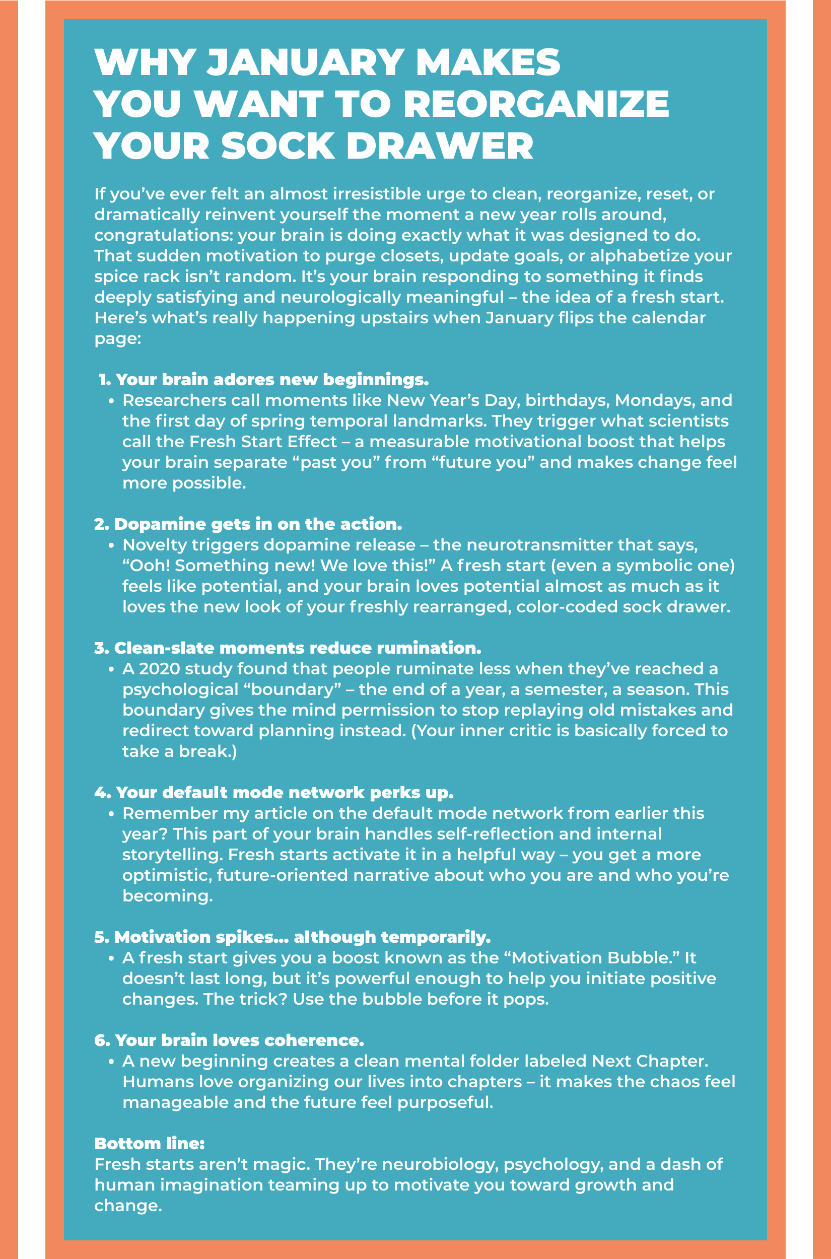 Think of one person you bumped, bruised, or accidentally steamrolled this year. Something small counts. You’re not confessing your sins – you’re repairing a connection. Just say you’re sorry. Science confirms this repair benefits both of you more than you might think.